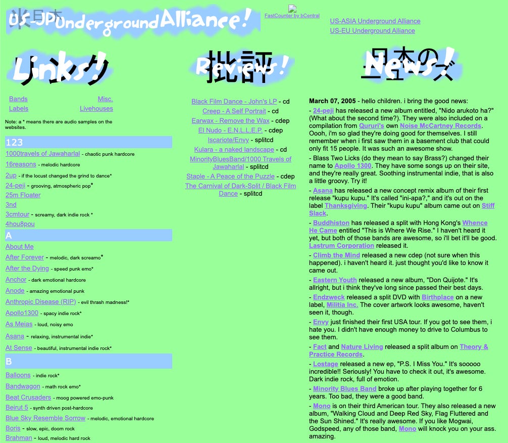 I called the link page “US/JP Underground Alliance”. By the magic of the Wayback Machine, you can still view some snapshots of it, in all its pistachio green glory. The snapshots of it didn’t start until a year after I first created it. I think I kept on updating it, even introducing a news section, for many years. There are snapshots under the first domain (http://usjp.cjb.net) and its final resting place (http://usjp.childismine.com).